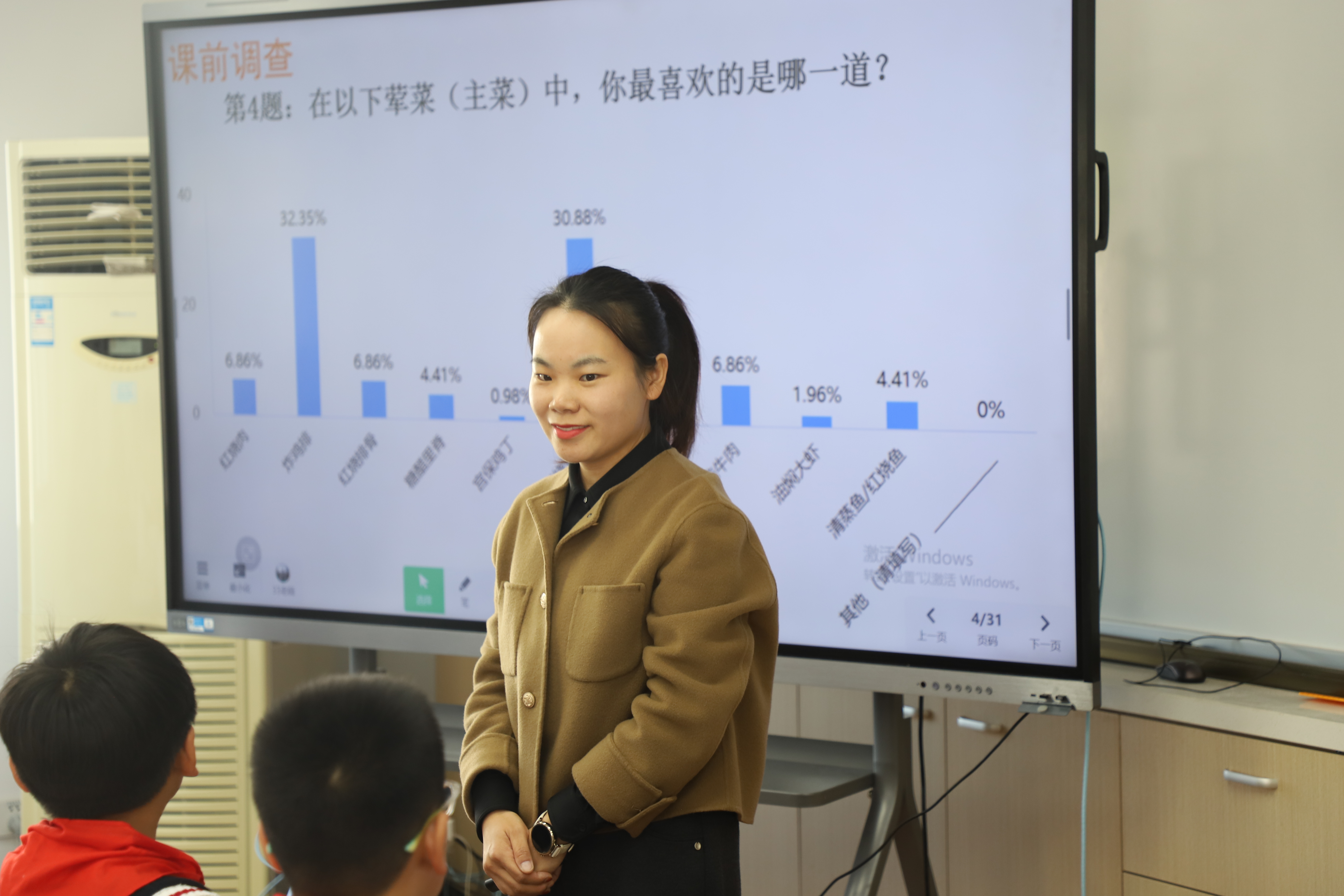随后,周珊珊老师与五(1)班的同学们共同呈现了一节精彩的数学“综合与实践”课——《“数”说午餐》。本节课以“设计营养午餐方案”为核心大任务,让学生们在进阶活动中,完整亲历了“对照标准—计算分析—替换菜品—优化方案”的学习路径。课堂不再是公式的枯燥演练,而是一个充满挑战的探究场。学生们不仅扎实运用了数学知识,更深刻感受到数学解决实际问题的力量。